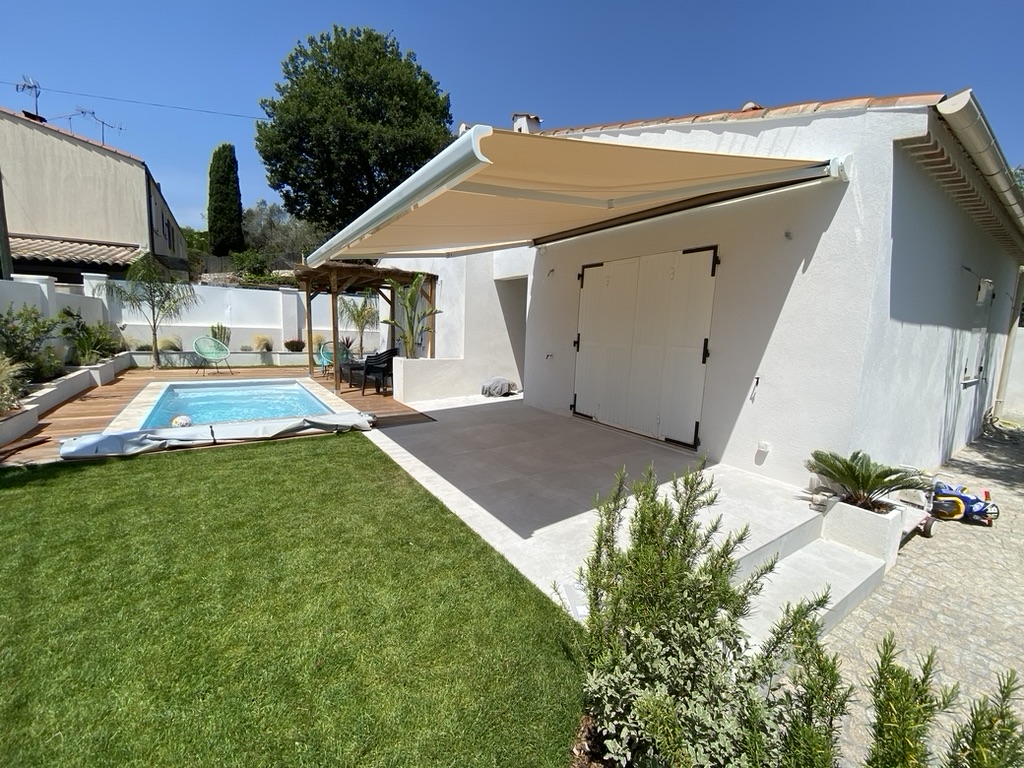 Pose d’un store toile coffre Blanc avec motorisation Somfy Io et télécommande TELIS pure 1c sur cette belle maison.