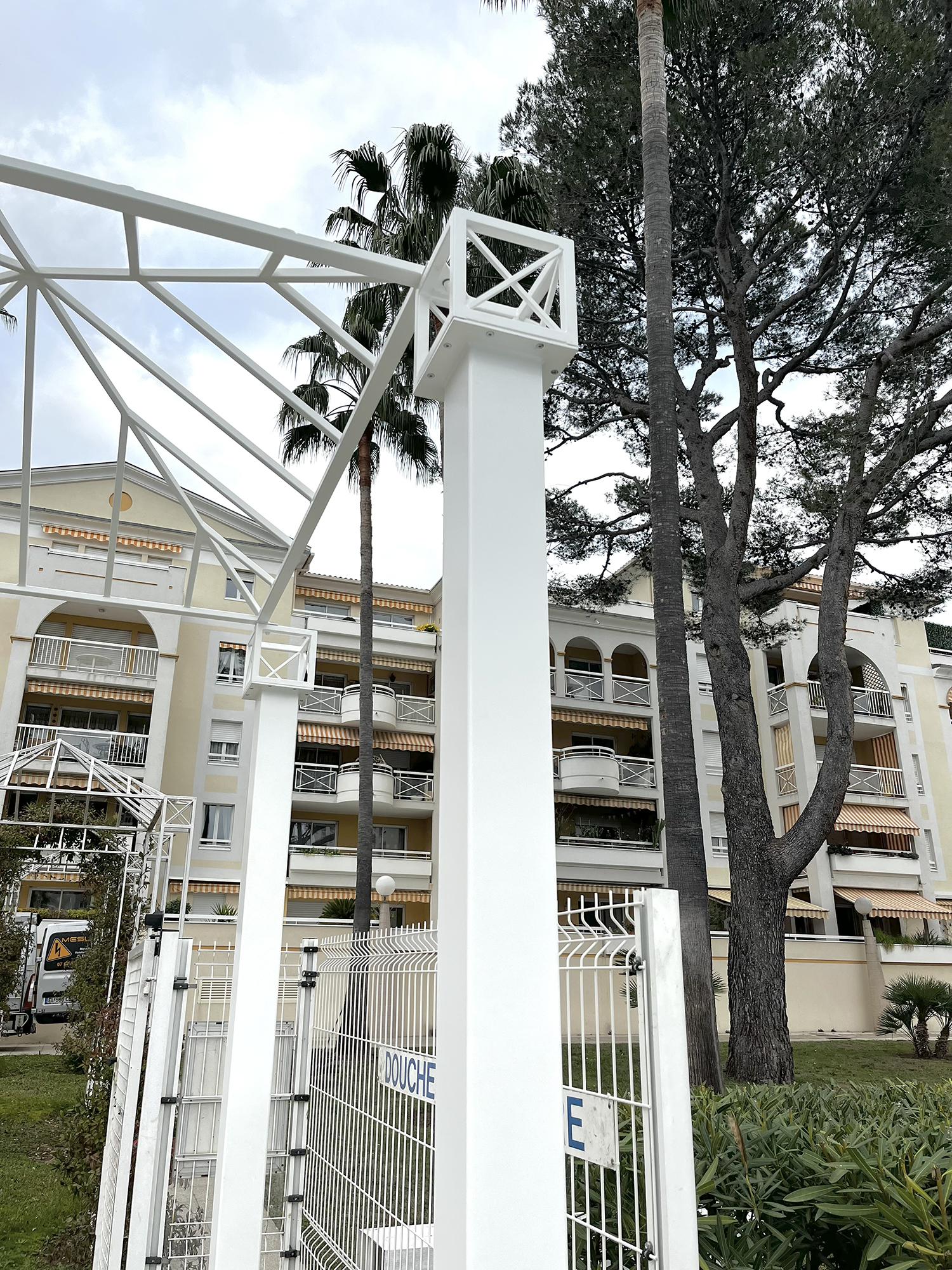 Rénovation d’une structure acier à l’entrée de cette piscine suite à de la corrosion perforante. Remplacement des piliers avec fabrication sur mesure. Rénovation de la partie haute. Thermo-laquage par notre partenaire. Et remise en place sur site.