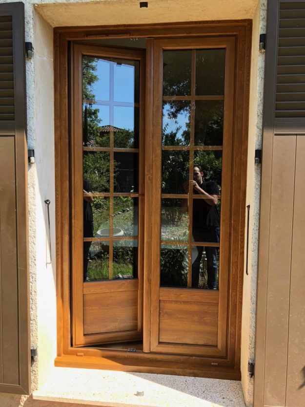 Nous vous présentons le remplacement de fenêtres traditionnelles bois par des fenêtres PVC Gamme PREFAL Equilibre Profils GELAN, double vitrage et Finition faux bois chêne doré intérieur & extérieur.