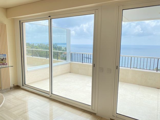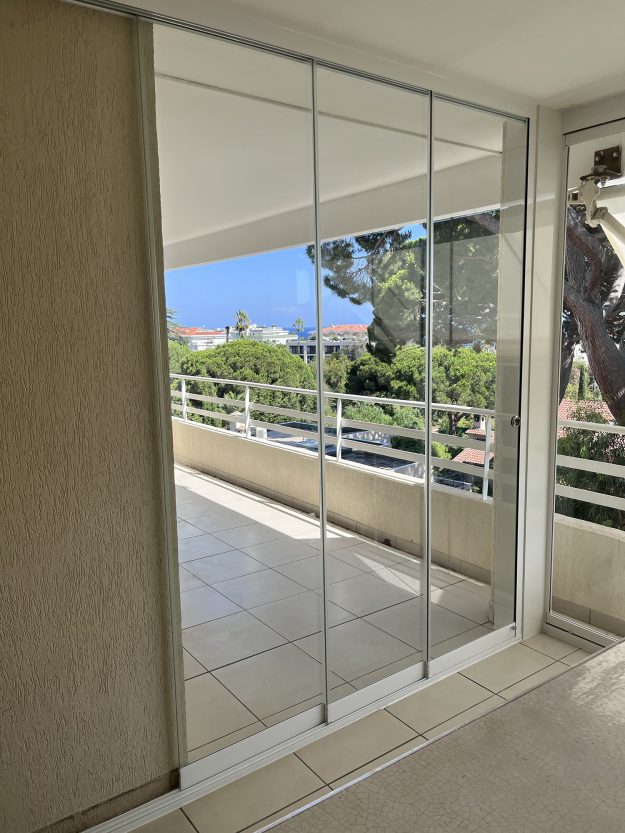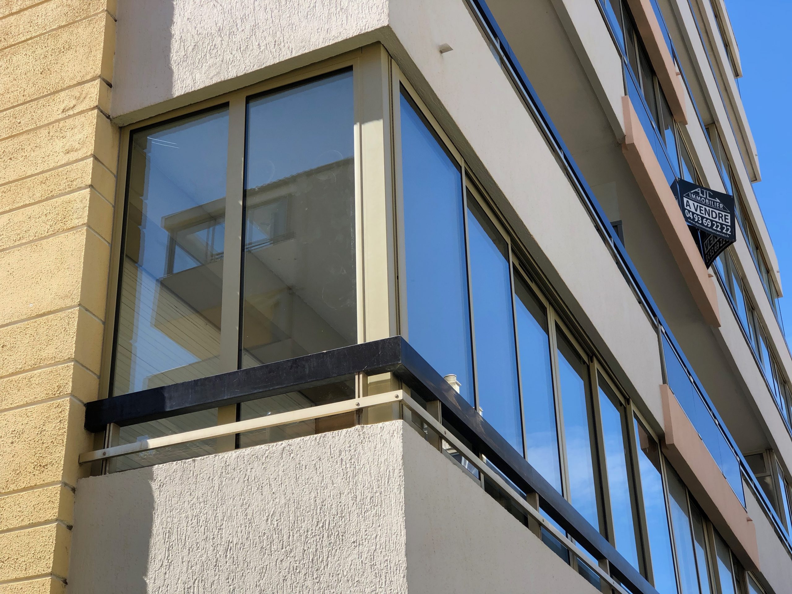 Fourniture et pose de fermeture pour une terrasse. Réalisation sur mesure pour cette terrasse à la demande de notre client. Parois coulissant panoramique en verre trempé avec rail PMR et fermeture parois de verre trempé rétractable panoramique pour garder une belle vue sur la mer.
